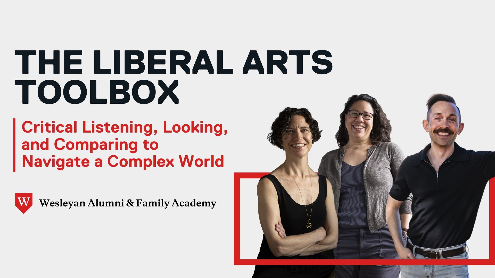 Rooted in the philosophy of pragmatic liberal arts education, this year’s Wesleyan Alumni & Family Academy will explore how critical listening, looking, and comparing are skills in the liberal arts tool kit that can be applied beyond the classroom to strengthen thoughtful engagement in everyday life, at a time when it is more important than ever.