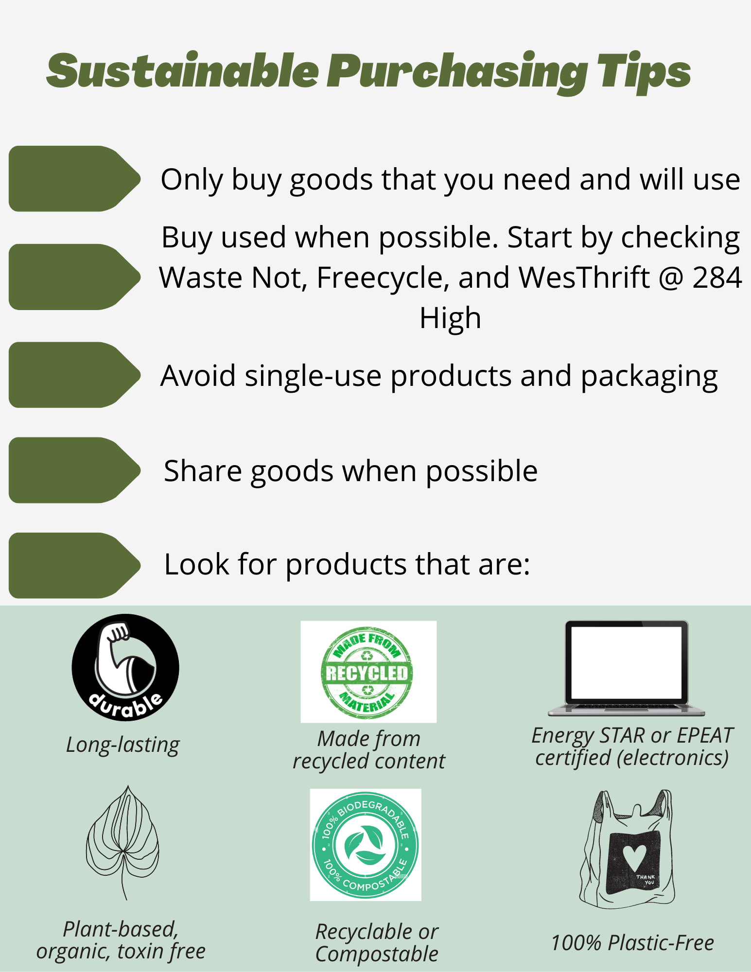 Learn more here about recycling, the Freecycle reuse program, campus composting programs, the free WesThrift store and rental program, Sew What tailoring program, and the annual Waste Not collection and tag sale.
